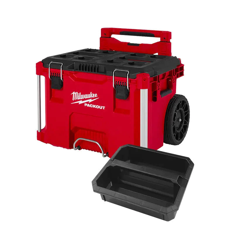 Marca: Milwaukee Modelo: 4822-8427 Dimensiones: 56.1 x 47.2 x 49.5 cm Altura total: 109.2 cm Rodado: 23 cm de diámetro Capacidad de carga: 113 kg Contenido: Bandeja organizadora interior